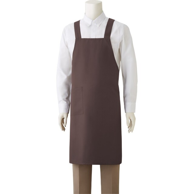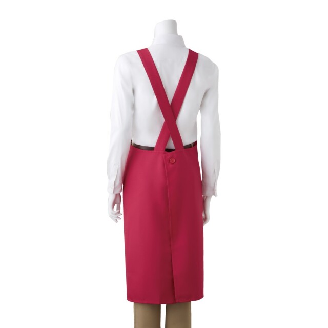 体を包み込み、汚れをガードするX型ボタン止めエプロン。
