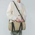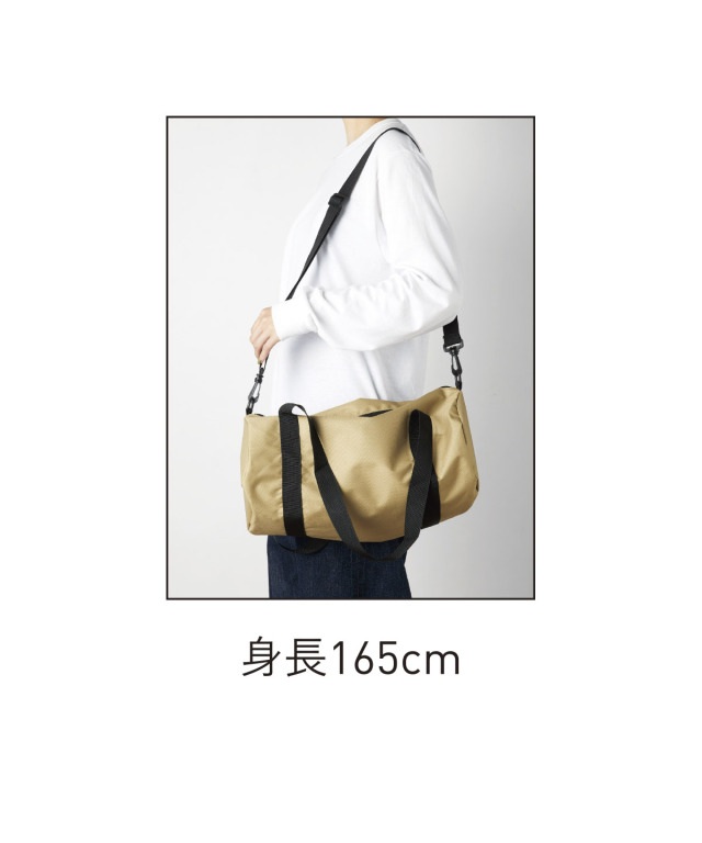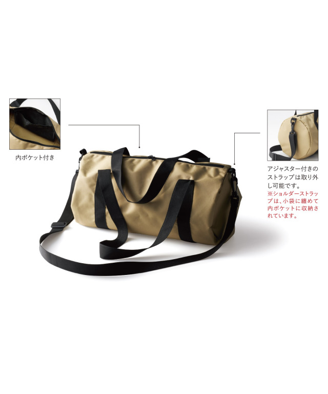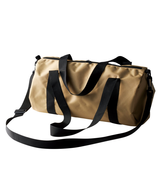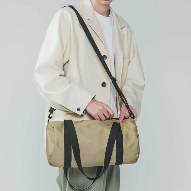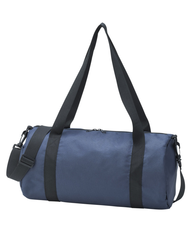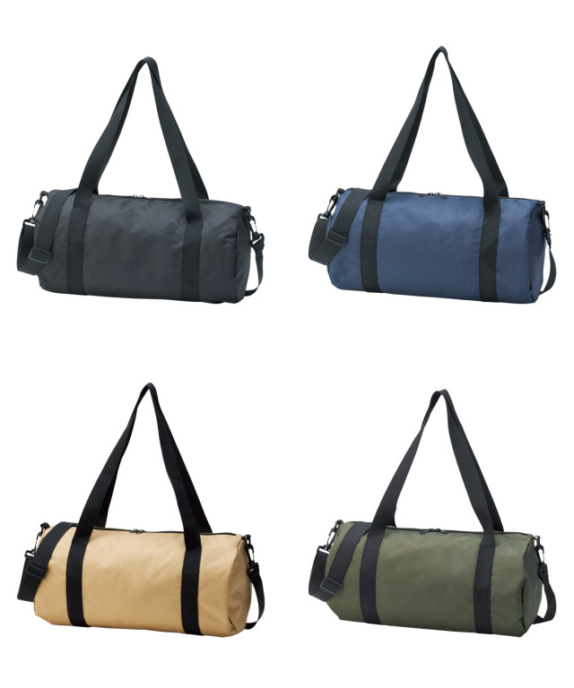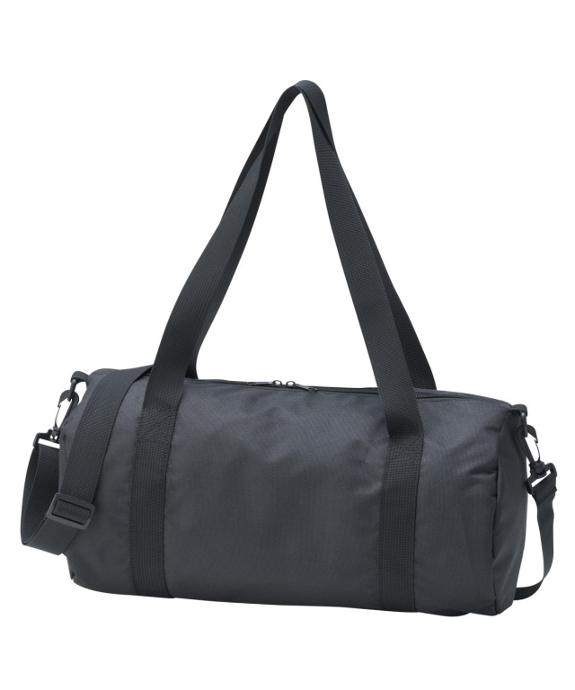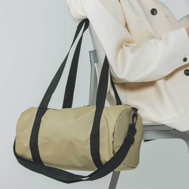 再生ポリエステルを使用したドラムバッグ。手持ちでも肩掛けでも扱いやすい2WAY仕様。