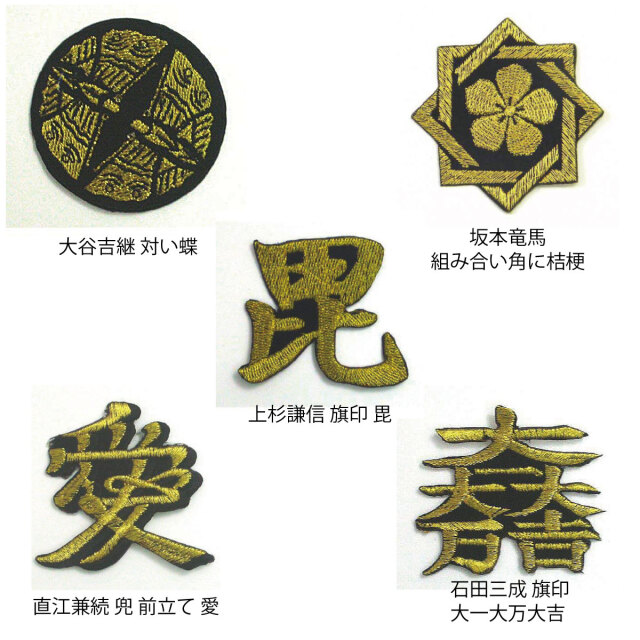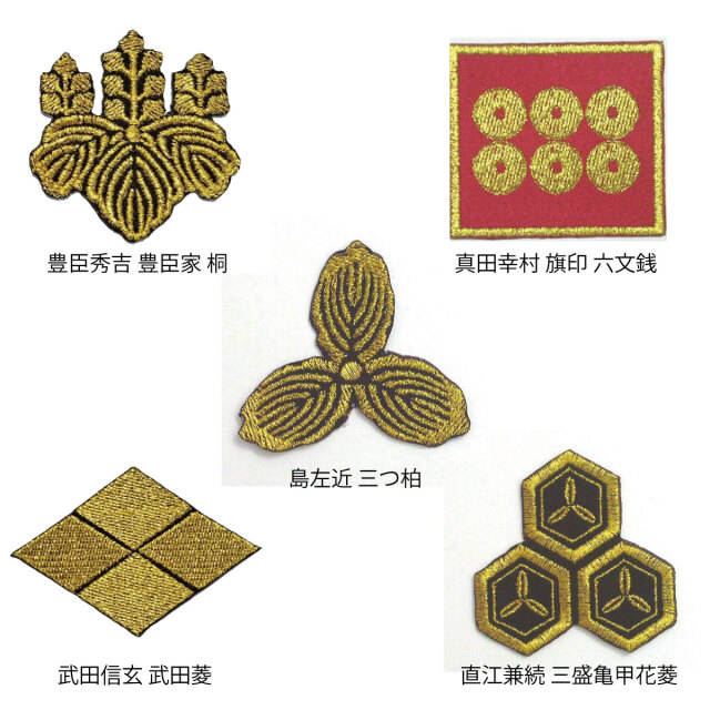 アイロンでの貼り付けが可能な戦国武将の家紋や旗印を刺繍したワッペン です。